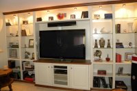 Custom media stands with speaker fabric door inserts can really clean up your custom sound system.